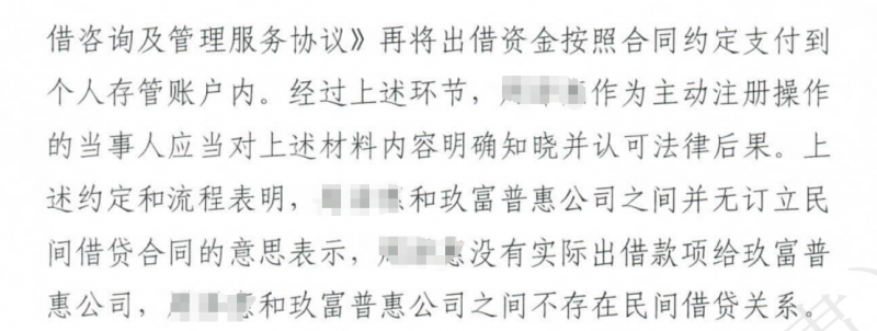 在案件审查中,甘肃省高院认为本案的焦点问题是:出借人和玖富普惠公司之间是否存在民间借贷关系。该关系成立应以双方具有借贷合意且款项实际交付为要件,缺一不可。依据兰州中院原审查明的事实:出借人与玖富普惠签订《出借咨询及管理服务协议》,再将出借资金按照合同约定支付到个人存管账户内。出借人作为主动注册操作的当事人,应当对上述材料内容明确知晓并认可法律后果。裁定书中明确提到,出借人和玖富普惠公司之间并无订立民间借贷合同的意思表示,出借人没有实际出借款项给玖富普惠公司,出借人和玖富普惠公司之间不存在民间借贷关系。