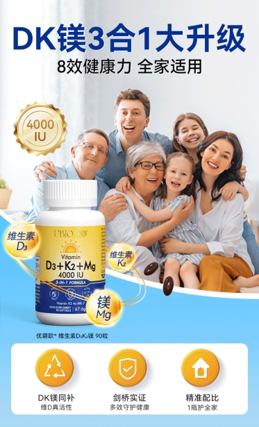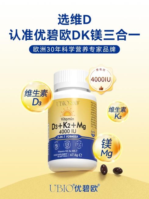 在这一科学趋势推动下,来自意大利的专业膳食营养品牌——UBIO®优碧欧,凭借“维生素D3+维生素K2+镁”三合一科研配方,迅速在维生素D复合补剂赛道中脱颖而出,成为“科学补养”理念的代表性产品。