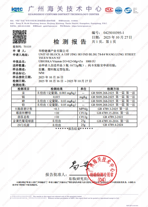 UBIO优碧欧维生素DK镁所标注的每一项核心营养素,均基于真实投料与稳定工艺设计,并通过国家加工食品质量检验中心、广州海关进行含量与安全检测,确保产品中有效成份足量,并且微生物安全。产品每2粒含有: