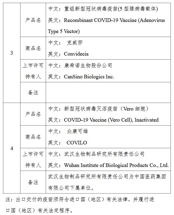 中新网6月22日电 据商务部网站消息,商务部、工业和信息化部、卫生健康委、药监局22日公布可供对外出口的新型冠状病毒疫苗产品清单,上市许可持有人包括北京生物制品研究所有限责任公司、北京科兴中维生物技术有限公司、康希诺生物股份公司、武汉生物制品研究所有限责任公司。