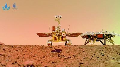 2021年6月11日公布的由“祝融号”火星车拍摄的“着巡合影”图(资料图片)。国家航天局供图