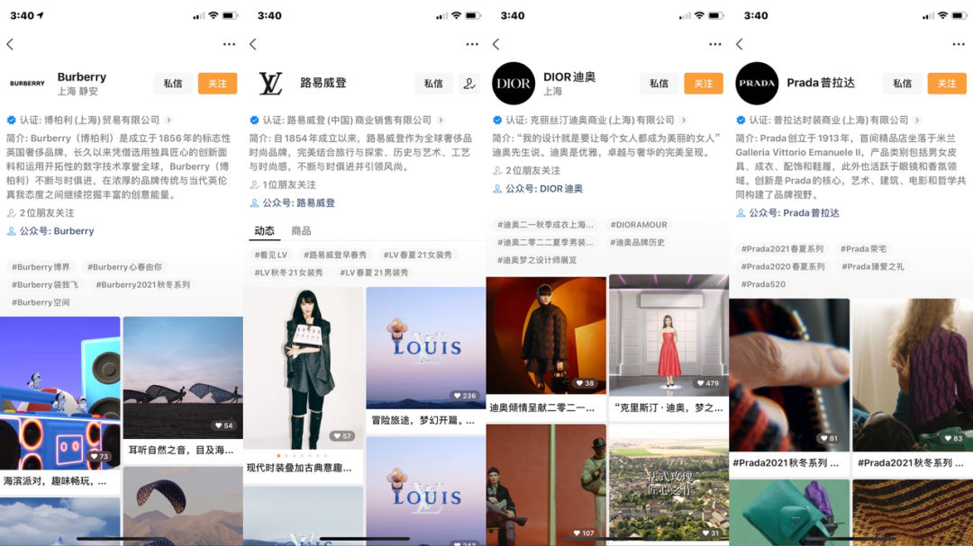 或许是吃一堑长一智,奢侈品牌明白了曾作为抖音、B站、乃至传统电商的后来者就很容易错过平台的红利期,陷入被动的局面,因此与以往对各个渠道相对拘谨、多次试探的态度所不同,奢侈品牌愿意成为新兴渠道的前行者。例如2020年开年以来,Prada、DIOR和Burberry等品牌就迫不及待的入驻了刚开启内测的微信视频号,成为最早的一批内容产出者。