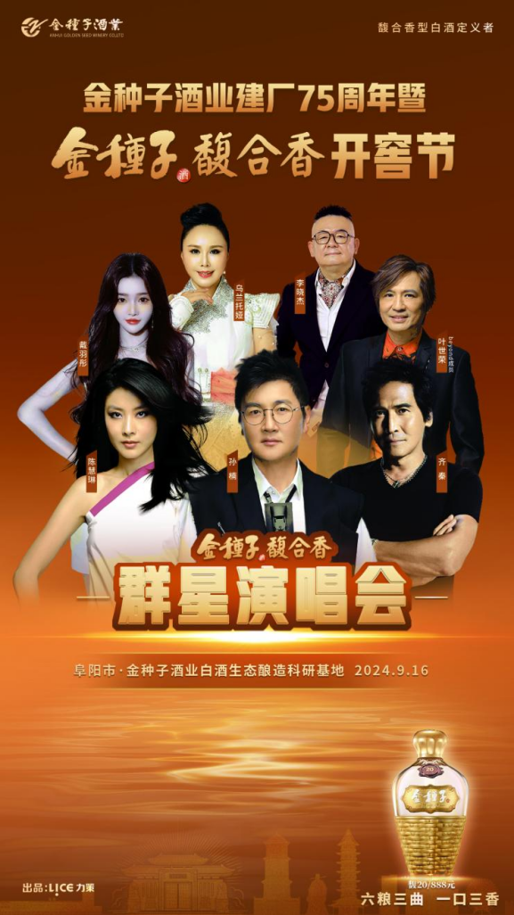 在今年的开窖节期间,金种子酒发乎于情,献之以礼,为阜阳市民、白酒爱好者献上一场音乐与美酒的盛宴。届时,孙楠、齐秦、陈慧琳、叶世荣、乌兰托娅、李晓杰、戴羽彤等明星齐聚阜阳,与您一起,共赴一场盛夏狂欢。
