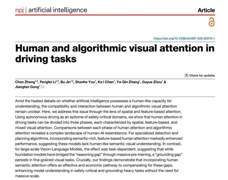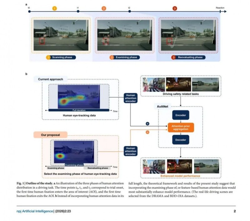 近日,清华大学智能产业研究院(AIR)团队在 npj Artificial Intelligence 发表题为《Human and algorithmic visual attention in driving tasks》的研究。该研究围绕自动驾驶这一安全关键场景展开,首次通过“人类眼动追踪实验 + 算法对比验证”的双轨设计,系统拆解了人类与算法在视觉注意力上的本质差异。研究采用了3×3×2混合实验设计,招募36名驾驶员(18名专家、18名新手),并结合眼动数据对驾驶注意力进行阶段划分,最终提出人类驾驶注意力可分为扫描、检查、重新评估三个阶段,其中“检查阶段”的语义注意力,是提升算法性能的关键入口。