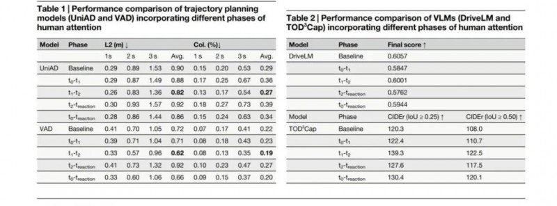 研究进一步验证了一个更重要的问题:算法虽然在空间定位上有优势,但在语义显著性提取上仍存在明显短板。团队将不同阶段的人类注意力融入 AxANet、UniAD、VAD、DriveLM、TOD³Cap 等模型后发现,检查阶段注意力带来的提升最稳定,也最显著。例如,AxANet 在异常检测任务中,融入检查阶段注意力后,准确率从 0.724 提升到 0.736;而将扫描阶段注意力融入后,准确率反而下降到 0.709。轨迹规划任务中,UniAD 的平均 L2 误差从 0.90m 降至 0.82m,VAD 的碰撞率也出现下降。相较之下,大模型在高维推理任务中并未明显受益,而在细粒度视觉接地任务中则仍能看到语义注意力带来的提升。这些结果共同说明,真正能补上算法缺口的,不是简单模仿“看哪里”,而是补入“为什么看、看到了什么意义”的语义注意力。