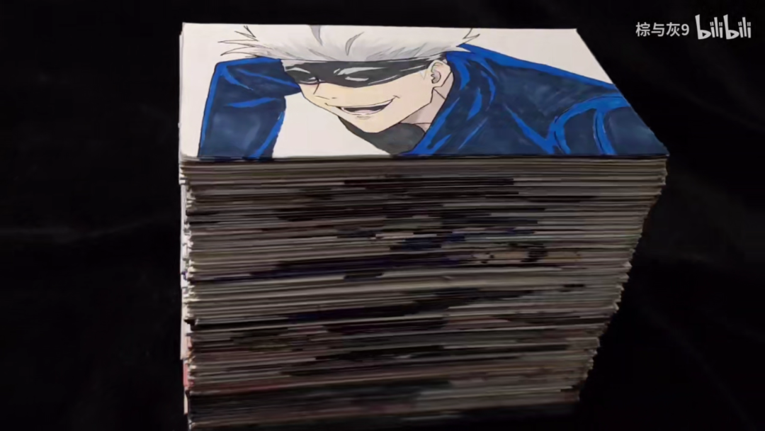 比如UP主@棕与灰9 就曾爆肝327张手绘,用绘画复刻了动漫《咒术回战》中的战斗场景,让五条悟在纸上动了起来。